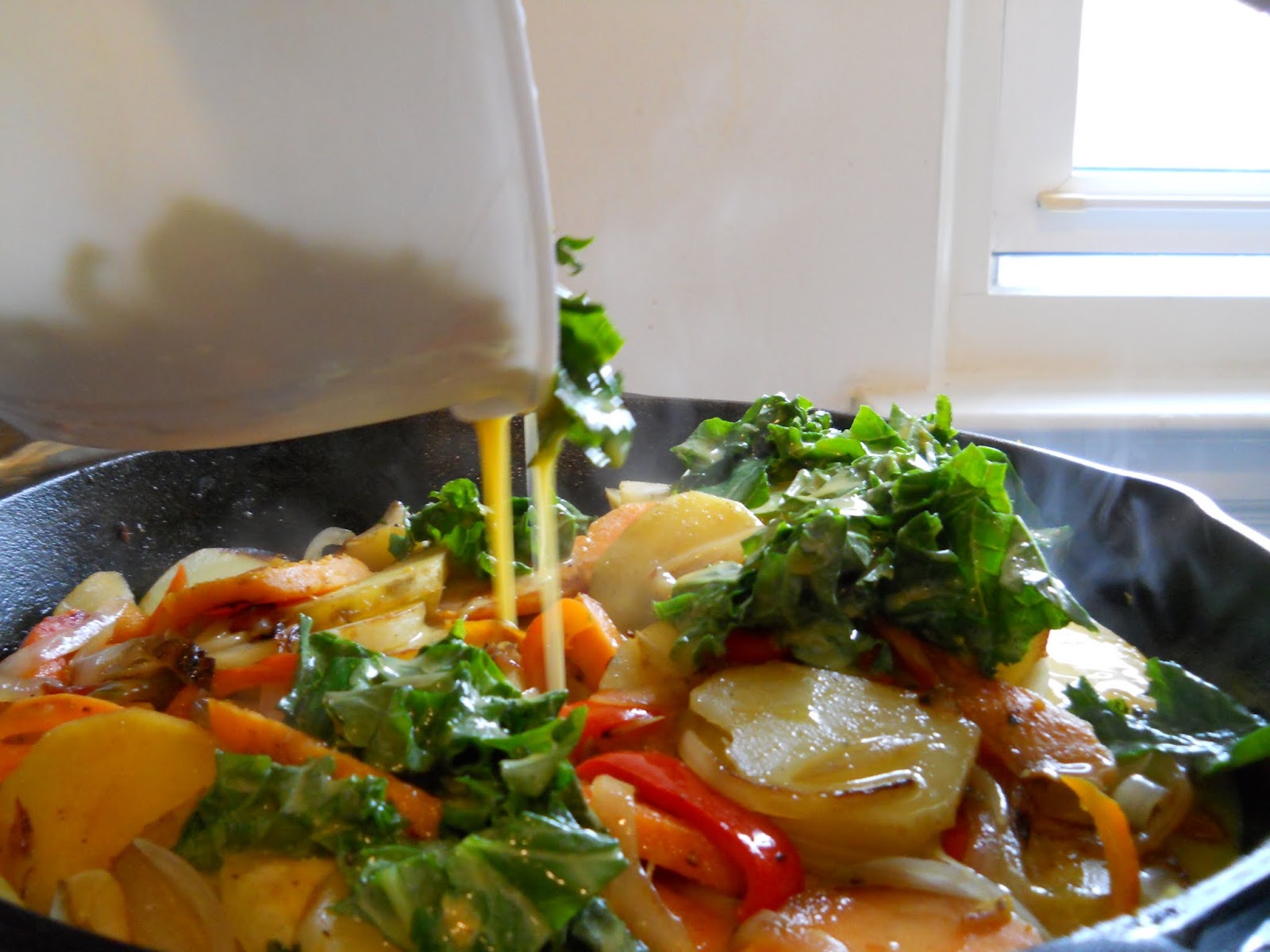 Heat the oil on medium low heat in a large cast iron skillet. Layer the potatoes in the skillet and cover, turning every five minutes for about 15 minutes. Add the peppers, onion, and garlic. Continue to cook, covered, turning once for another 10 minutes or until the potatoes are tender. While the potatoes cook, whisk the eggs in a large bowl with the nutritional yeast, salt, pepper, and almond milk. Add the kale and basil to this mixture and stir to blend. Preheat the oven to 350 degrees.